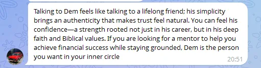 In the business world, it’s rare to find someone with Dem’s level of experience who stays so approachable. His leadership style is conversational and deeply authentic, making complex financial growth feel achievable. You can sense his strength comes from a higher place—his faith and his values. For anyone serious about achieving success with integrity, Dem is the mentor who will treat you like a partner and lead you like a pro.